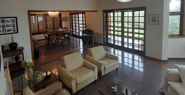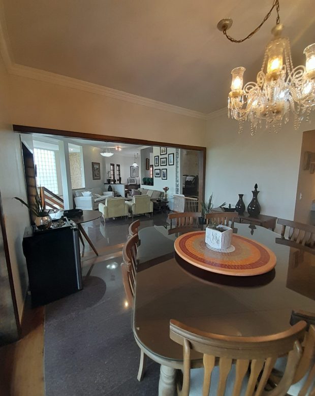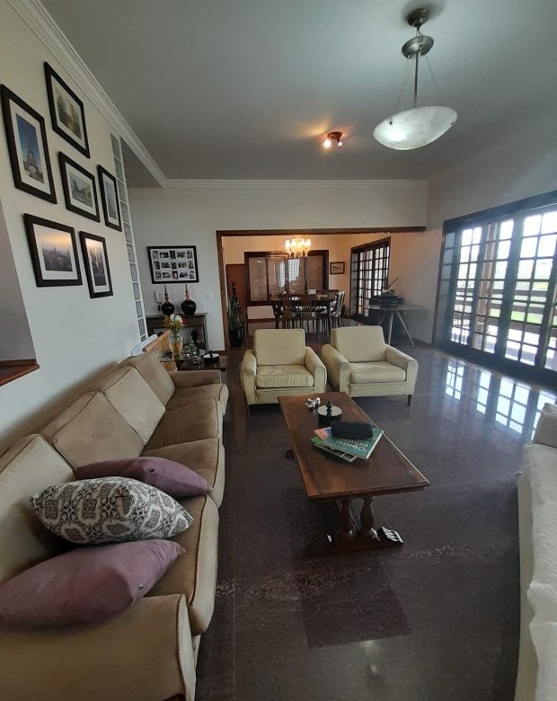 Logo ao entrar no imóvel, percebe-se o padrão elevado de construção. A casa conta com uma sala ampla para três ambientes, todos integrados e com piso em granito, composta por: