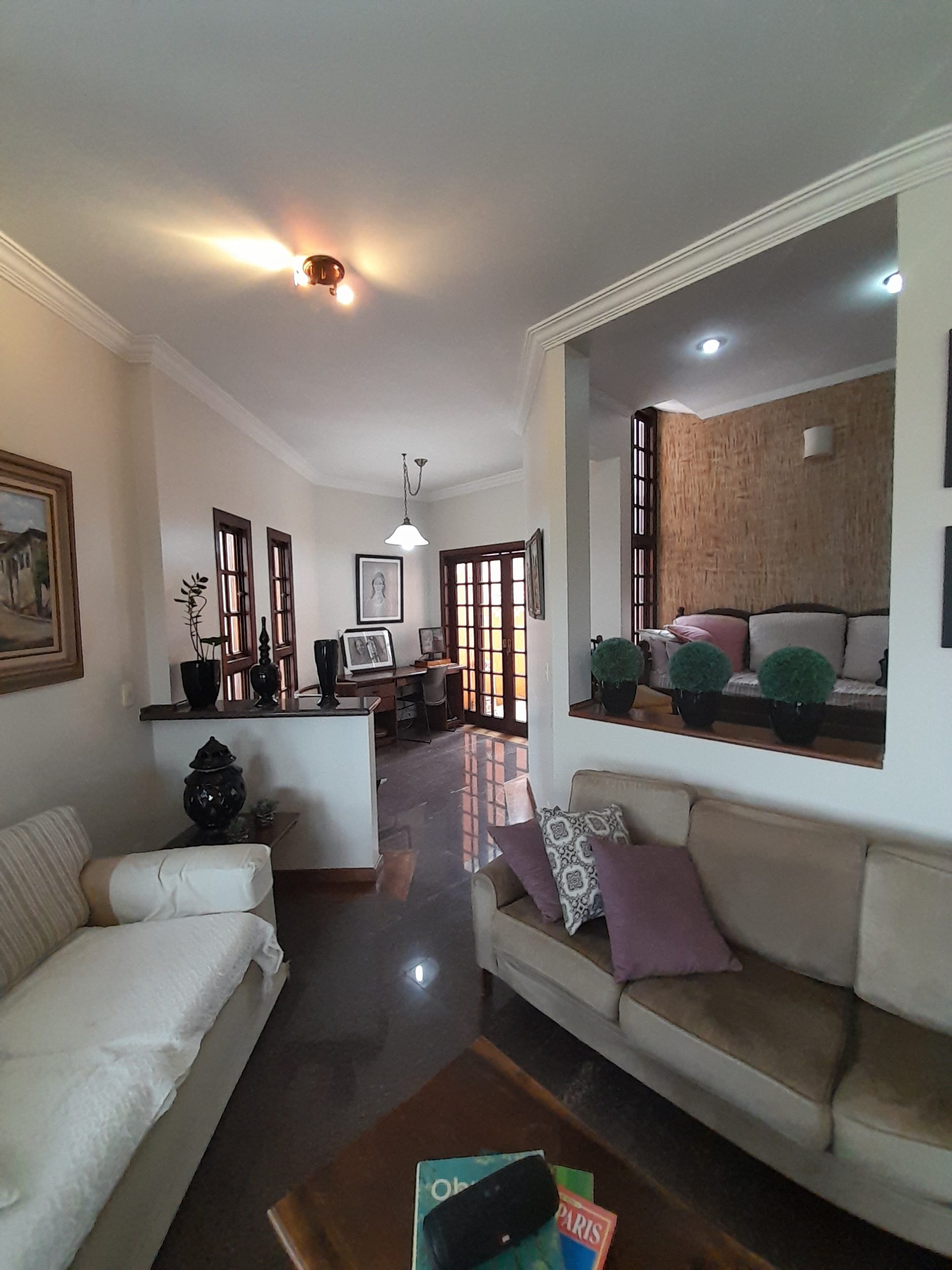 Logo ao entrar no imóvel, percebe-se o padrão elevado de construção. A casa conta com uma sala ampla para três ambientes, todos integrados e com piso em granito, composta por: