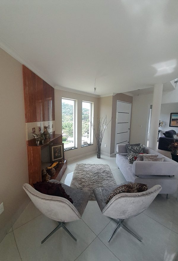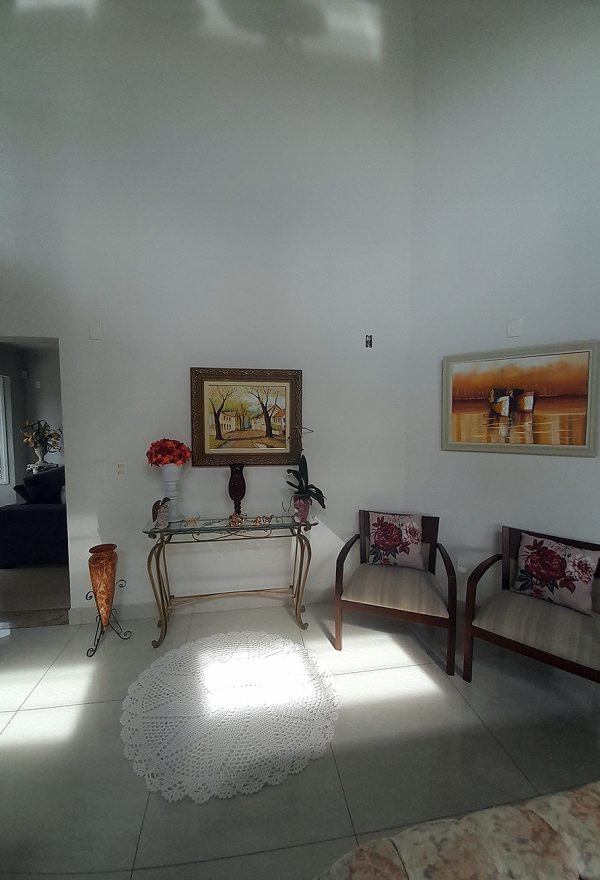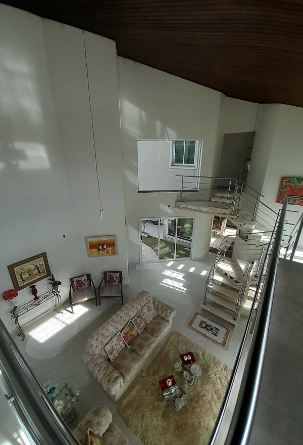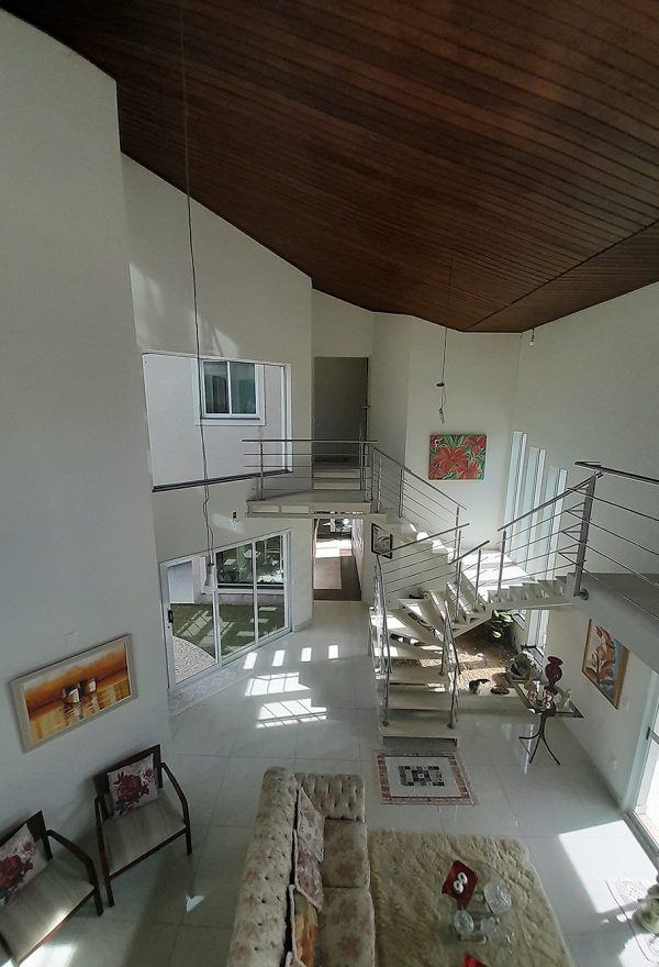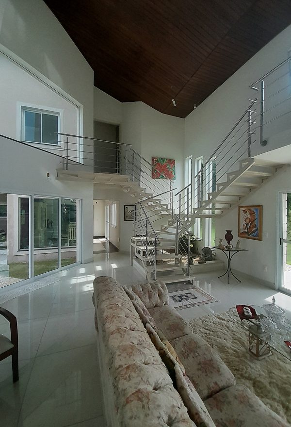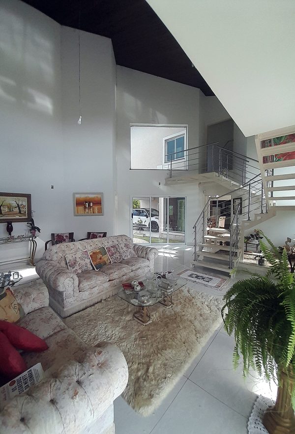 Logo na entrada, percebe-se que esta não é apenas uma construção de 326 m², mas um projeto pensado para acolher. O living com pé direito duplo confere uma sensação de liberdade e sofisticação imediata, permitindo que a luz natural preencha cada canto da área social.