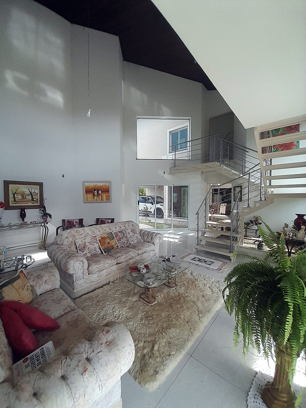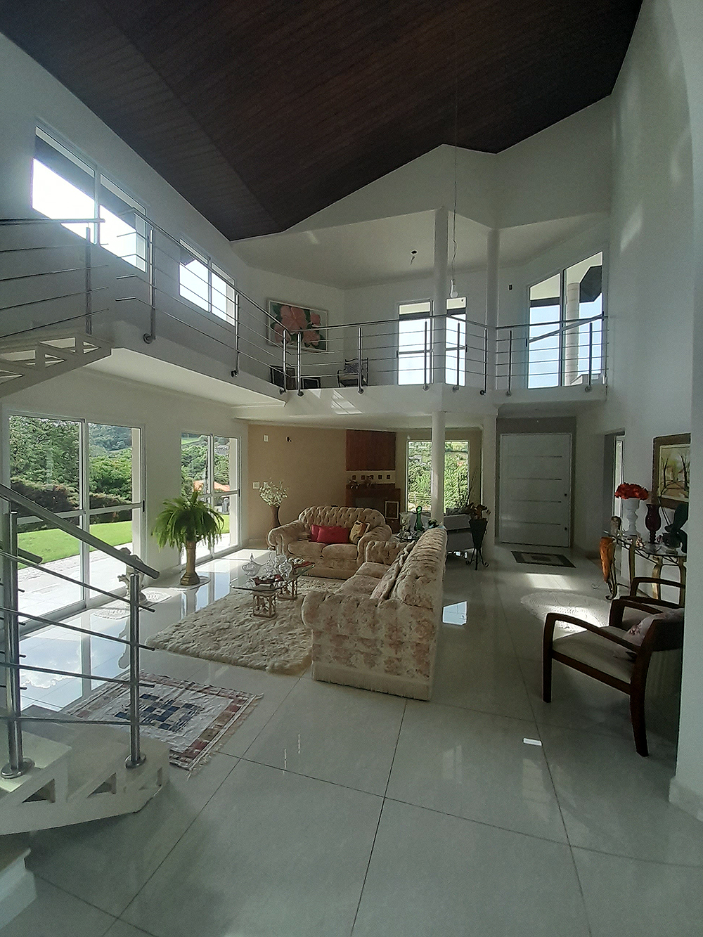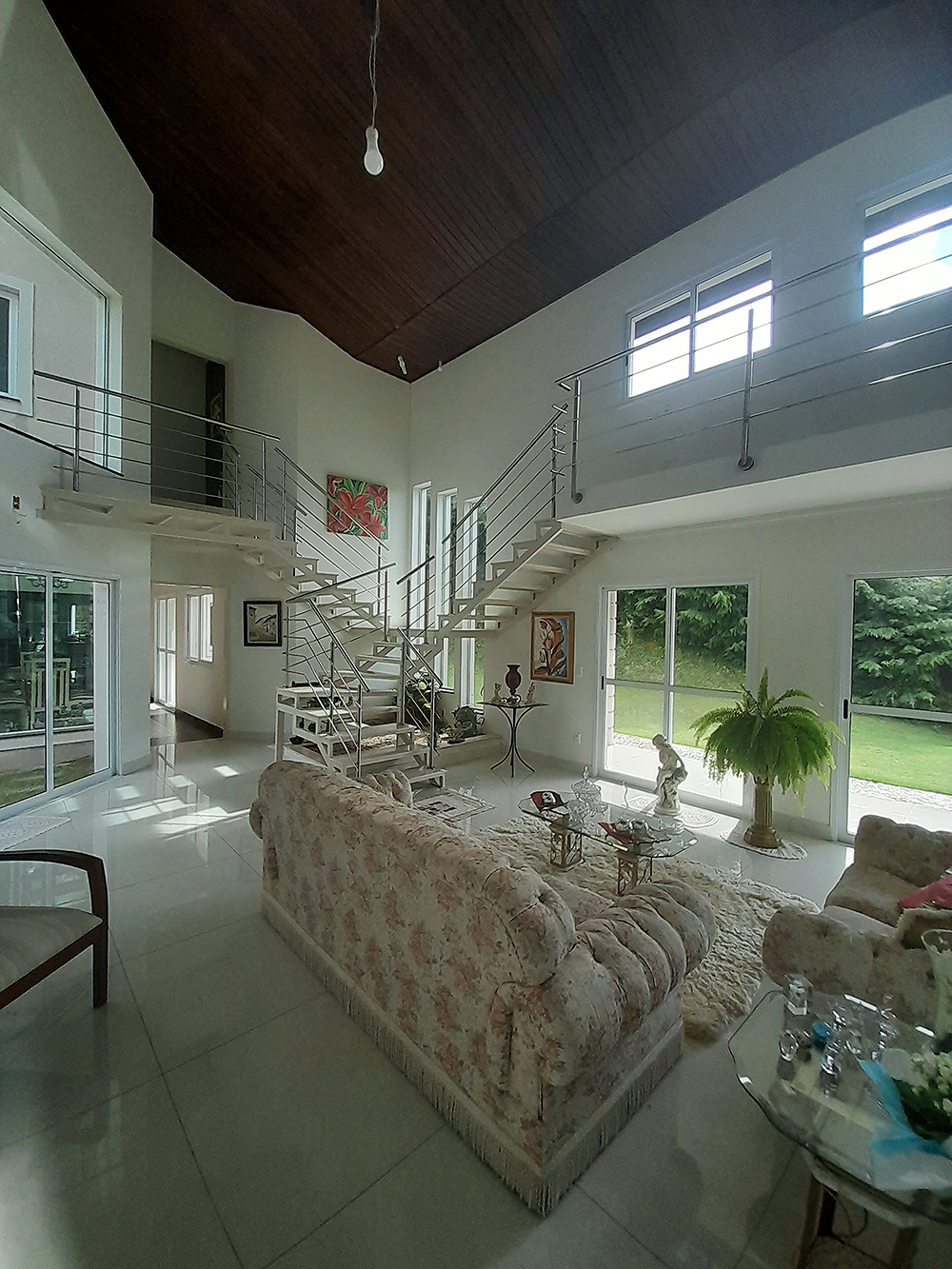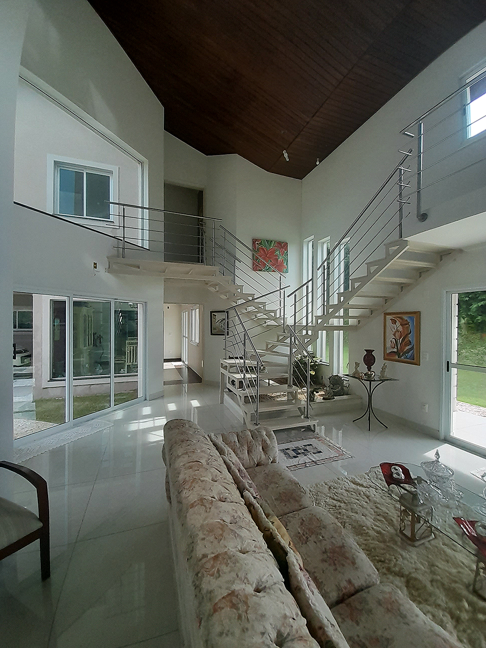 Logo na entrada, percebe-se que esta não é apenas uma construção de 326 m², mas um projeto pensado para acolher. O living com pé direito duplo confere uma sensação de liberdade e sofisticação imediata, permitindo que a luz natural preencha cada canto da área social.
