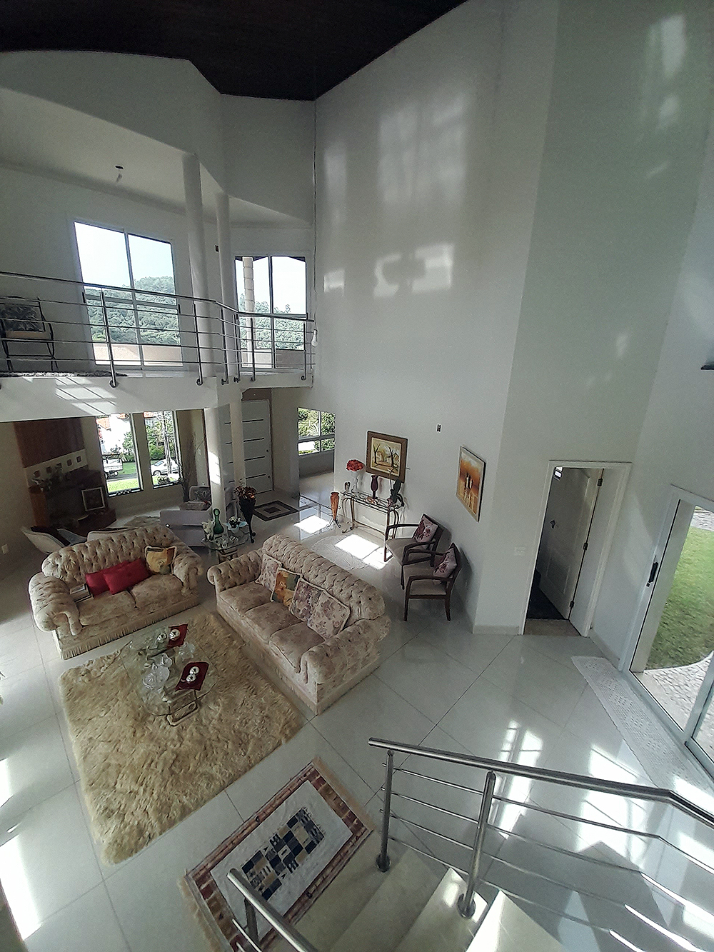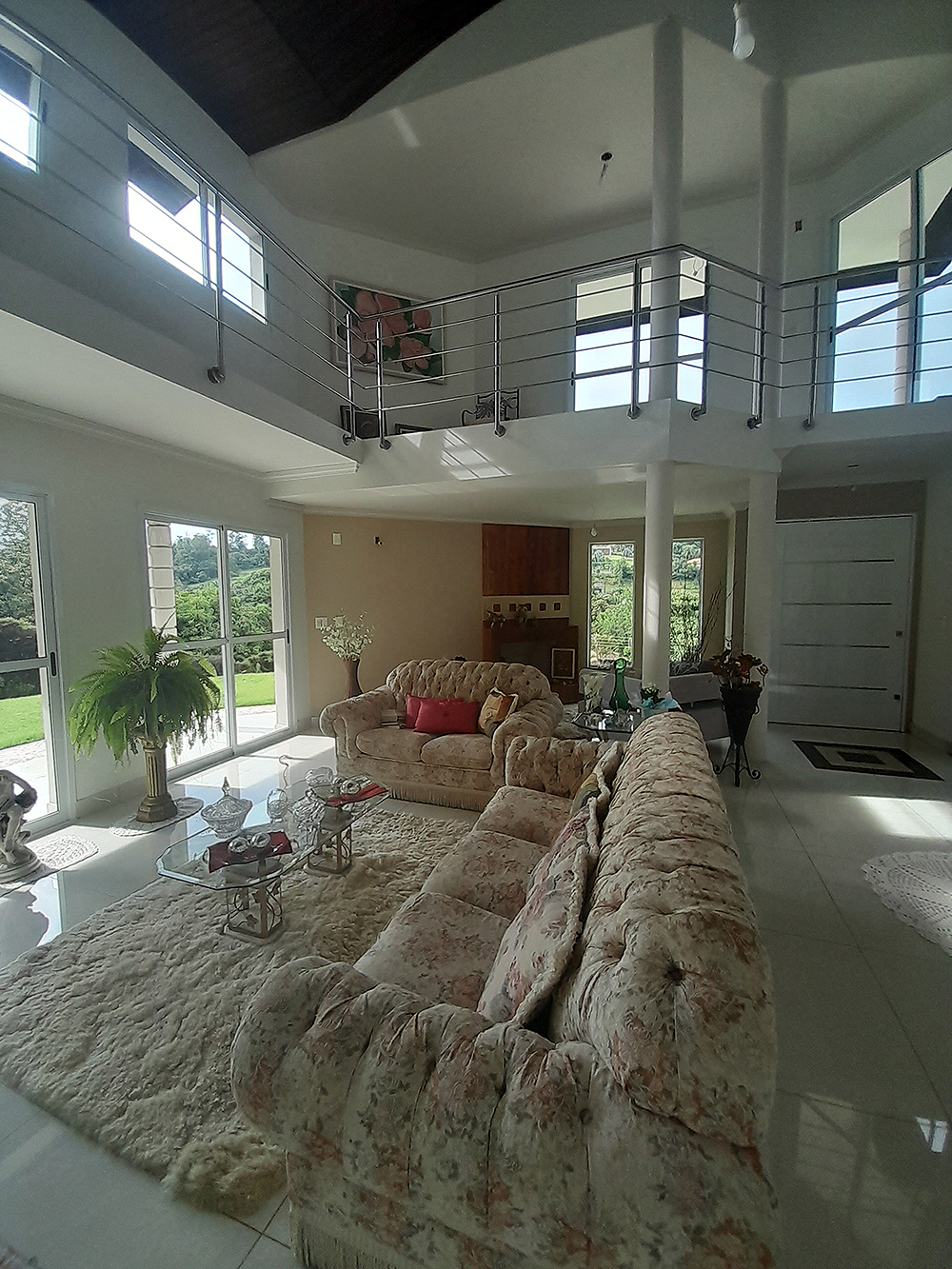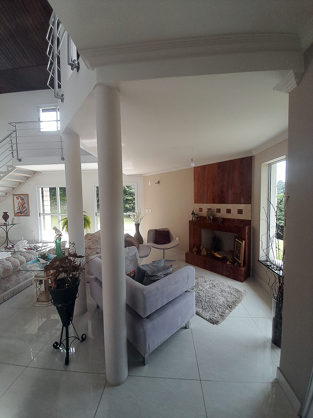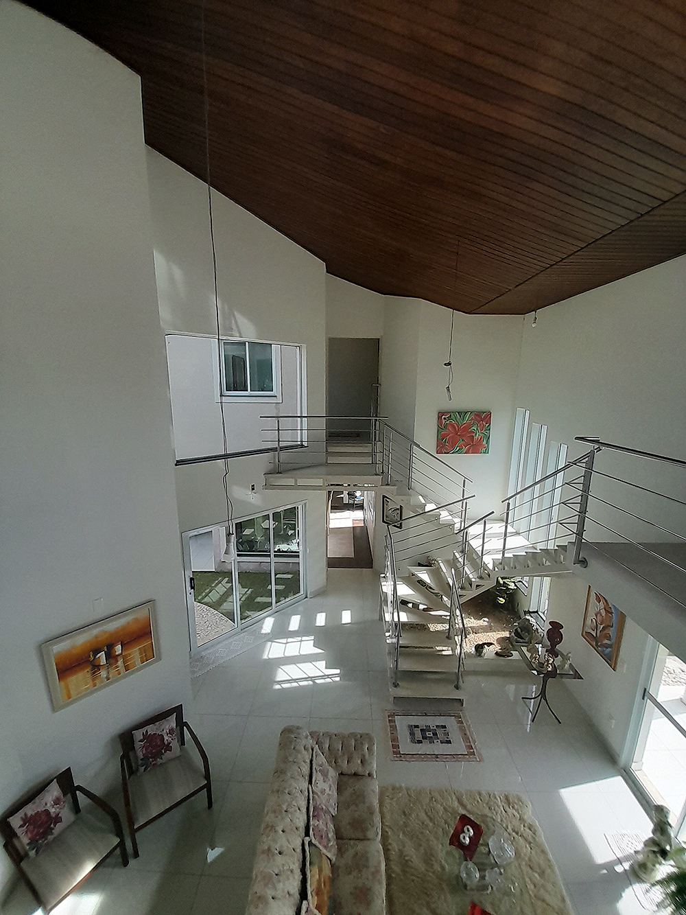 Logo na entrada, percebe-se que esta não é apenas uma construção de 326 m², mas um projeto pensado para acolher. O living com pé direito duplo confere uma sensação de liberdade e sofisticação imediata, permitindo que a luz natural preencha cada canto da área social.