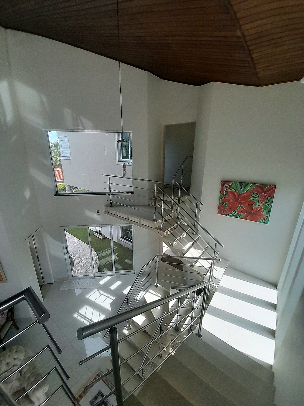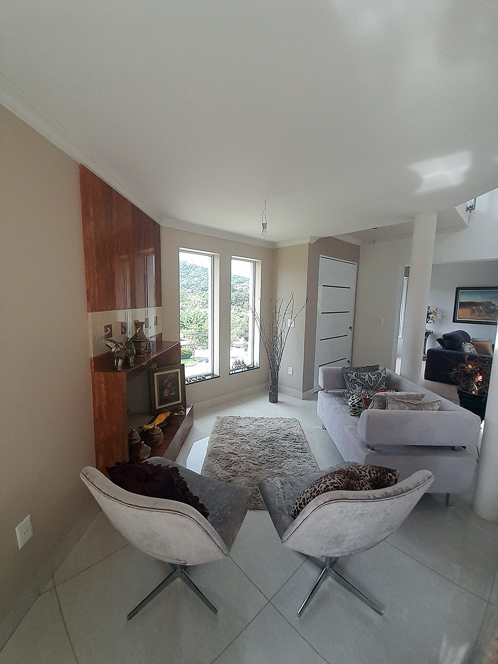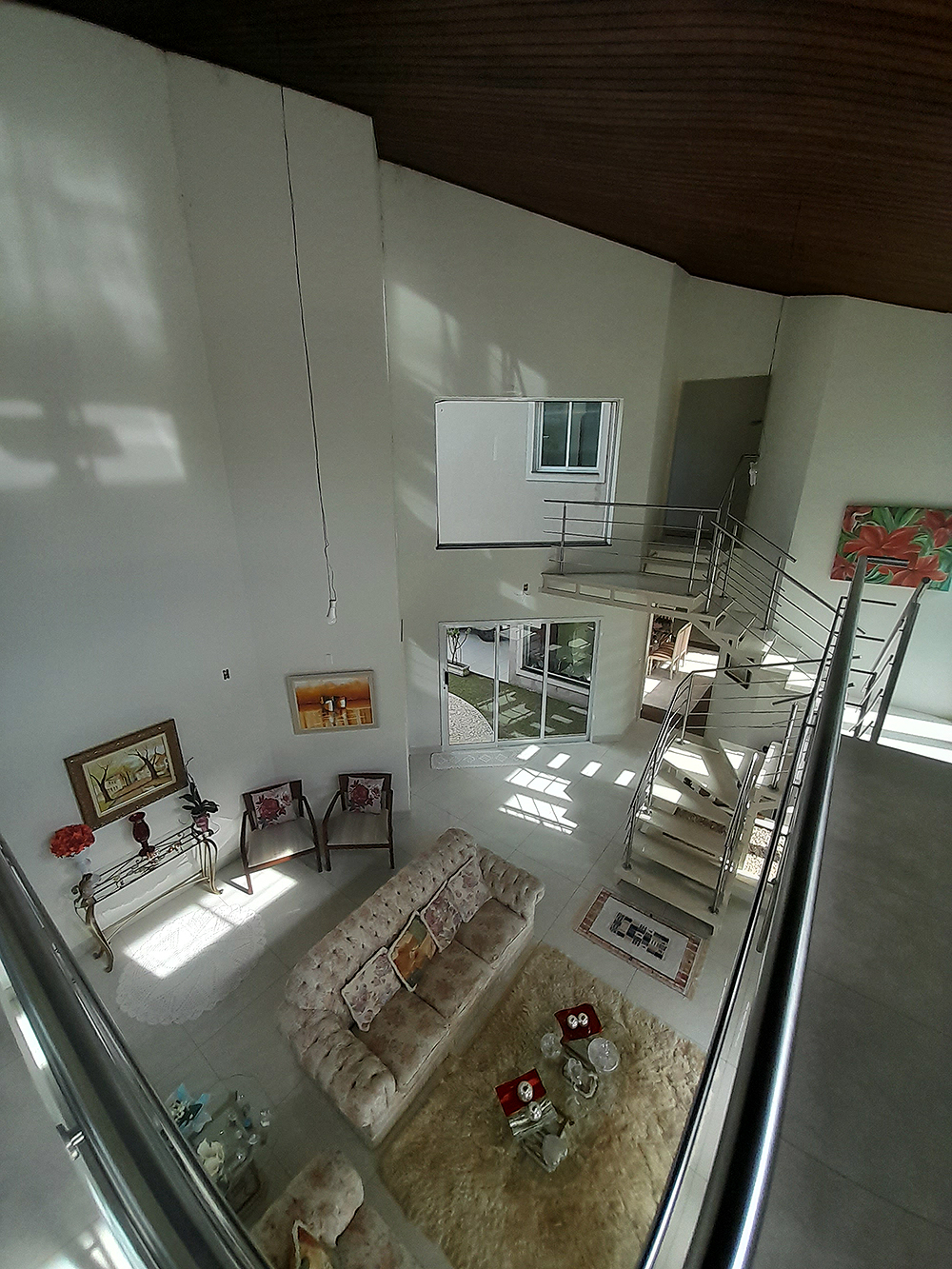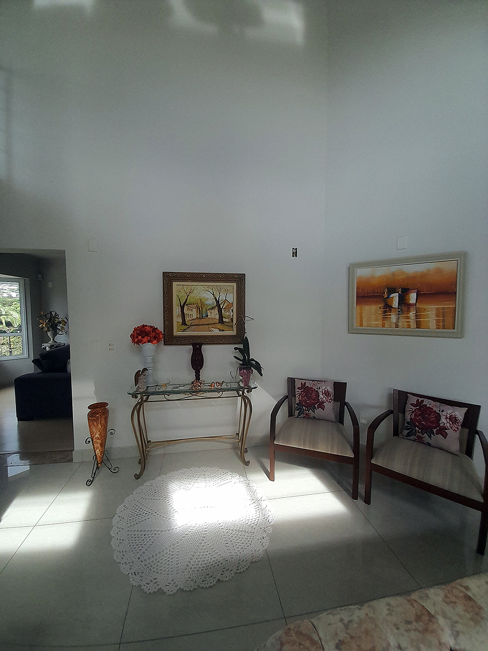 Logo na entrada, percebe-se que esta não é apenas uma construção de 326 m², mas um projeto pensado para acolher. O living com pé direito duplo confere uma sensação de liberdade e sofisticação imediata, permitindo que a luz natural preencha cada canto da área social.