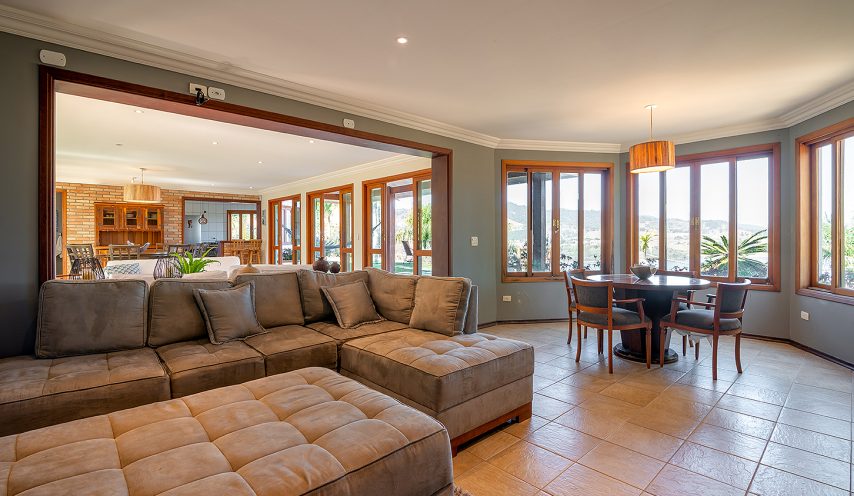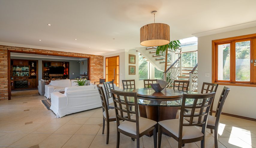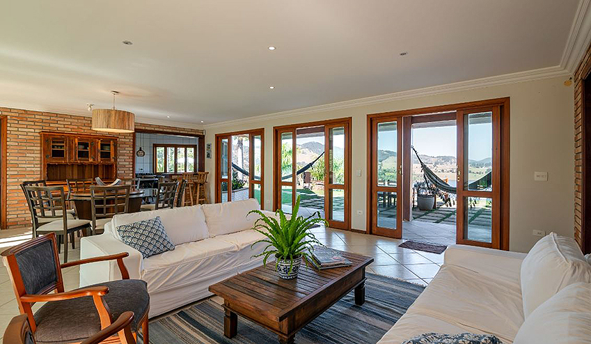 Ambientes planejados para proporcionar momentos memoráveis, além disso a arquitetura valoriza iluminação natural e ventilação, com portas e janelas de vidro voltadas para a paisagem da represa. A propriedade reúne salas amplas com mobiliário leve, lareira funcional, duas cozinhas completas, varanda panorâmica e área gourmet envidraçada. Cada espaço foi criado para integrar convivência, conforto e o cenário natural da represa.