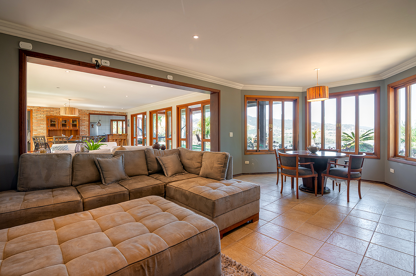 Ambientes planejados para proporcionar momentos memoráveis, além disso a arquitetura valoriza iluminação natural e ventilação, com portas e janelas de vidro voltadas para a paisagem da represa. A propriedade reúne salas amplas com mobiliário leve, lareira funcional, duas cozinhas completas, varanda panorâmica e área gourmet envidraçada. Cada espaço foi criado para integrar convivência, conforto e o cenário natural da represa.